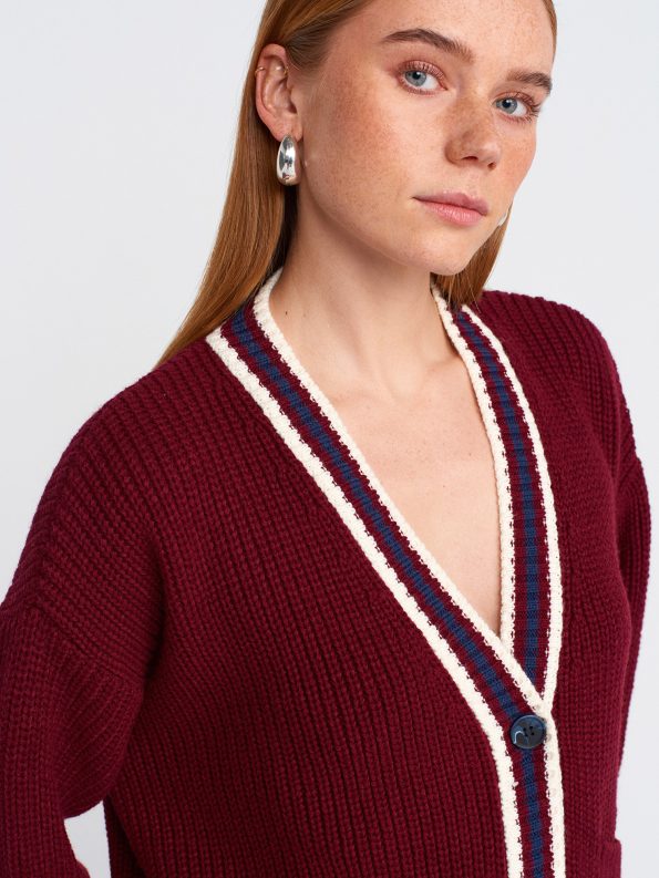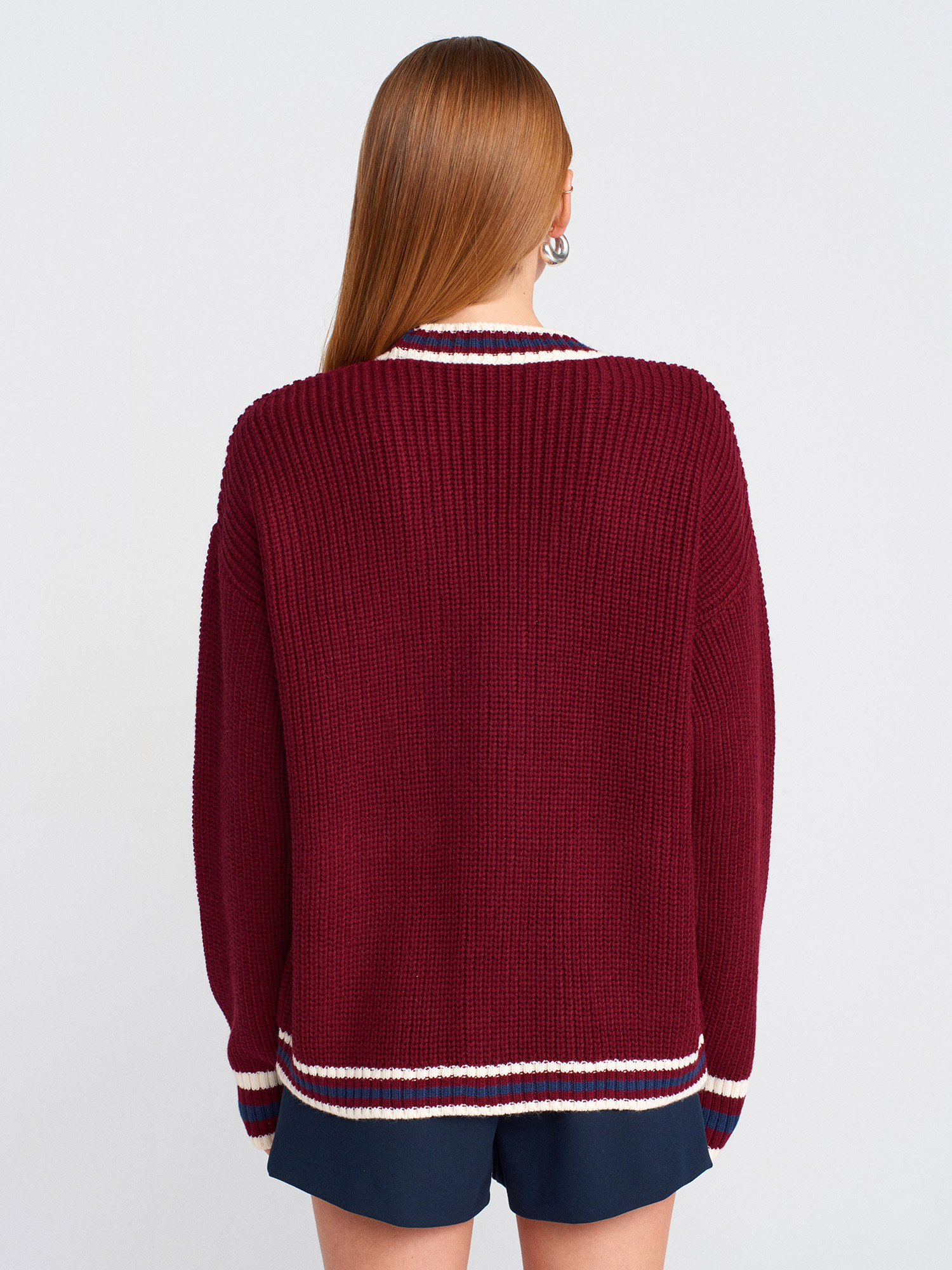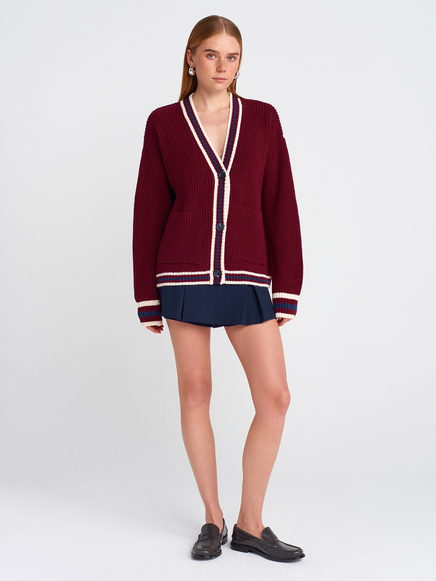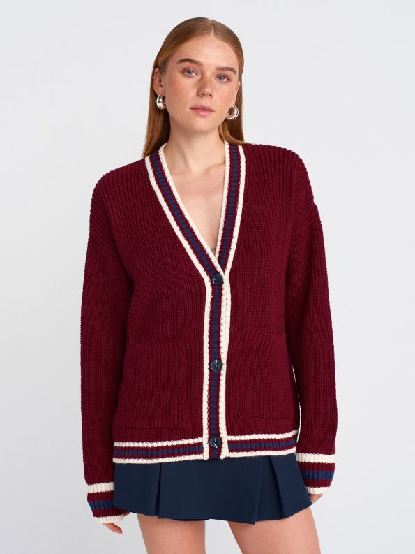 Etiket: Dilvin 60966 V Yaka Çizgili Düğmeli Selanik Triko Hırka-Bordo