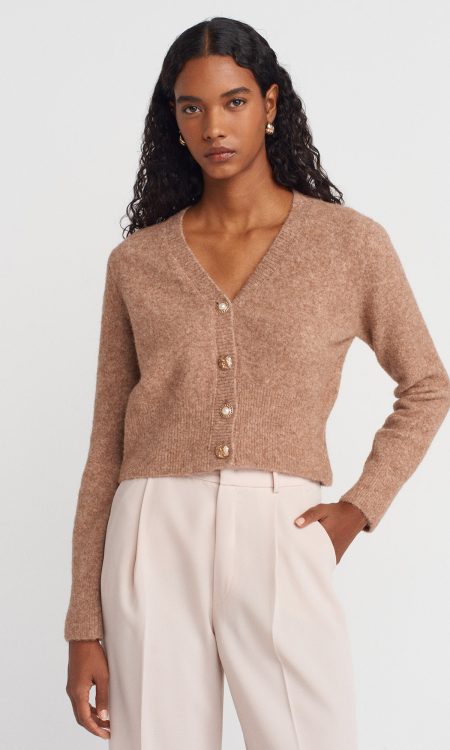 Etiket: Dilvin 60989 V Yaka Baklava Desenli Şardonlu Triko Hırka-Vizon