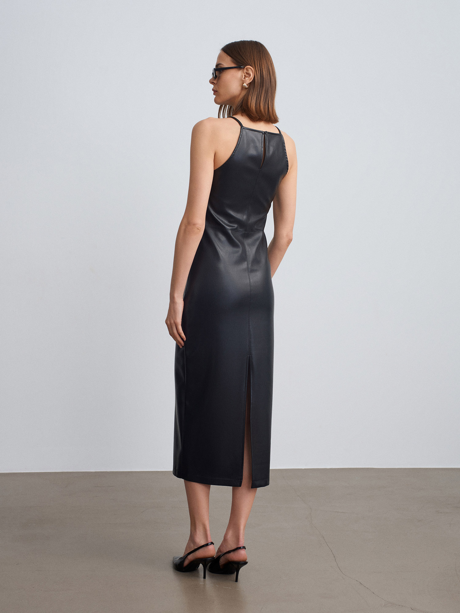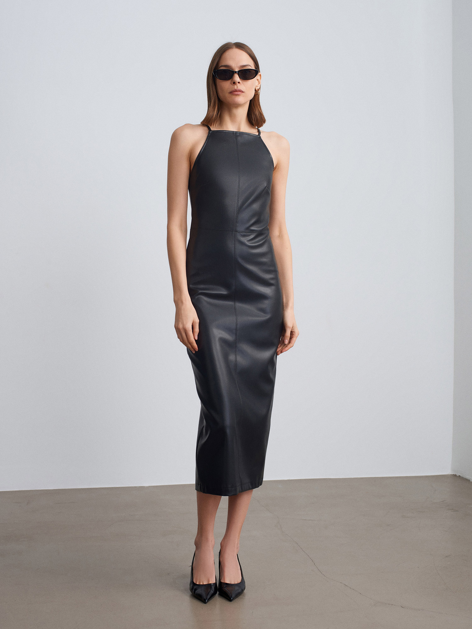 DİLVİN 90935 SUNİ DERİ MİDİ ELBİSE;