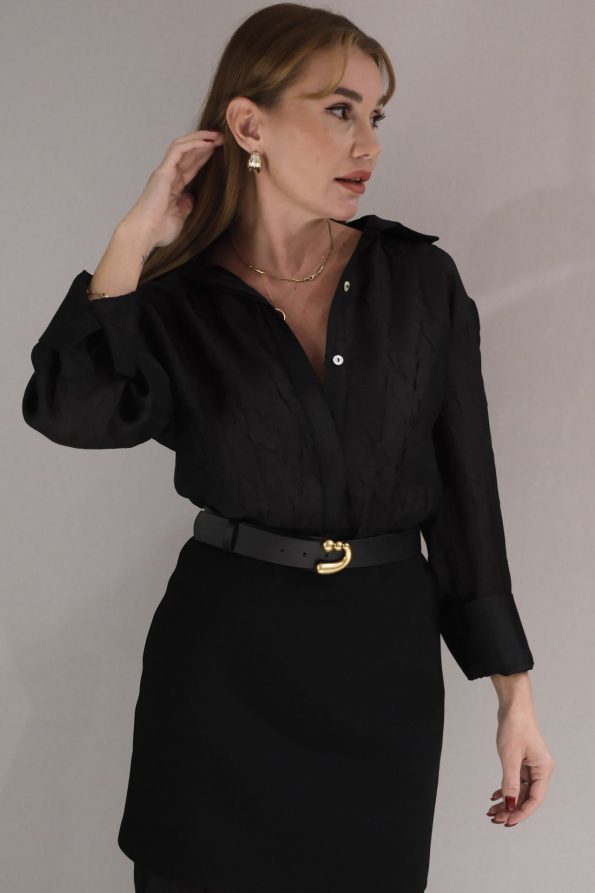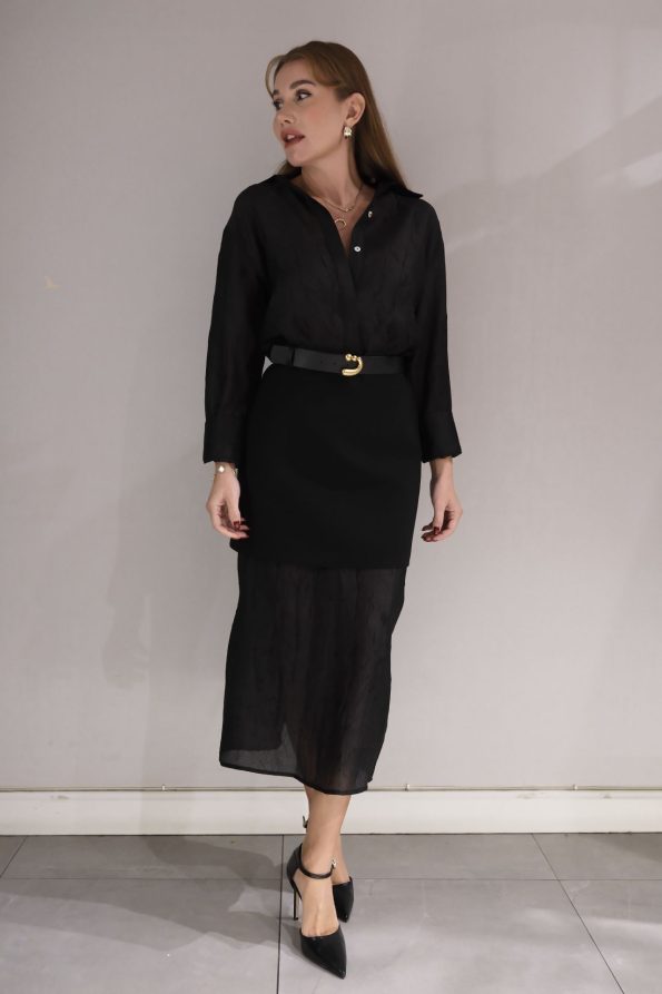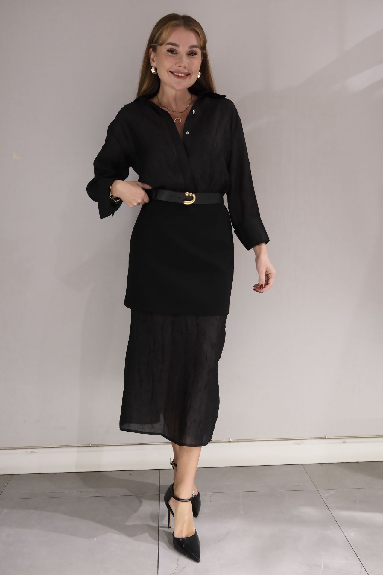 Etek ve gömlek detaylarını tek bir tasarımda buluşturan bu elbise, takım görünümlü modern bir siluet sunuyor. Üst kısmı gömlek formunda tasarlanmış olan elbise, alt kısmındaki etek yapısıyla bütünleşerek hem resmi hem de rahat bir görünüm yaratır. Günlük hayattan ofis stiline kadar geniş kullanım alanı sunan bu parça; sneaker, topuklu ya da loafer ile farklı tarzlara kolayca uyarlanabilir. Şıklığı pratiklikle birleştiren zamansız bir seçenek.